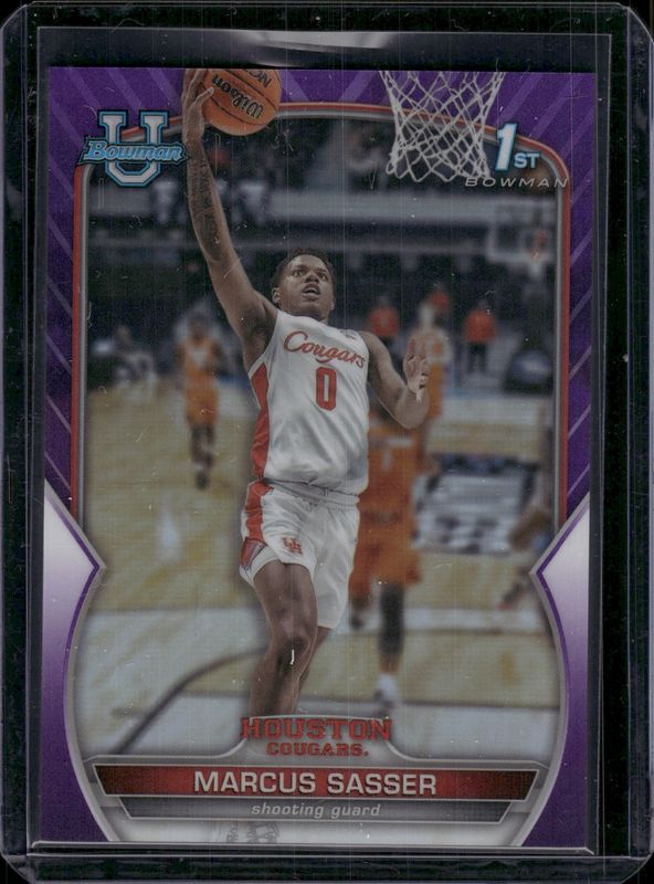 The Marcus Sasser 2022 Bowman Chrome University #93 Purple Refractor /399 card is 1 of 52 Marcus Sasser's card variations in the 2022 Bowman Chrome University set being tracked by Sports Card Investor, including Base, Pink Refractor, Purple Shimmer Refractor, Refractor, and Shimmer Refractor.