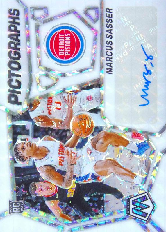 The Marcus Sasser 2023 Mosaic #PM-SAS Pictographs Autographs - White /25 Rookie card in Raw condition has not changed in price in the last 30 days and was last sold for $10.50 .