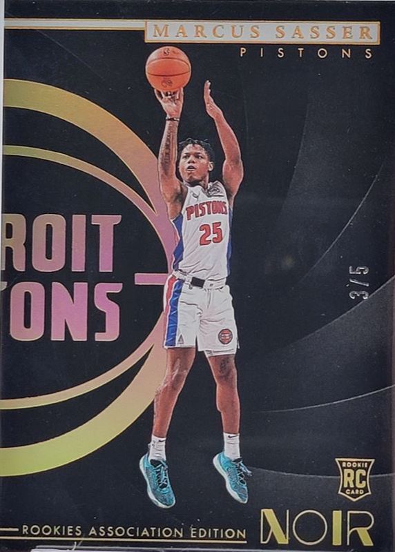 This card is 1 of 21 Marcus Sasser's card variations in the 2023 Noir set being tracked by Sports Card Investor, including Rookies Association Edition /99, Rookies Icon Edition /99, Rookies Metal Frame City Edition /25, Rookies Association Edition - Holo Silver /49, and Rookies Icon Edition - Holo Silver /49.
