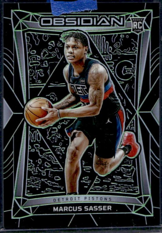 The Marcus Sasser 2023 Obsidian #156 Electric Etch Green /25 Rookie card is 1 of 92 Marcus Sasser's card variations in the 2023 Obsidian set being tracked by Sports Card Investor, including #203 Base, #156 Base, #156 Electric Etch International, #156 Electric Etch Neon Flood, and #156 Electric Etch Pink Pulsar.