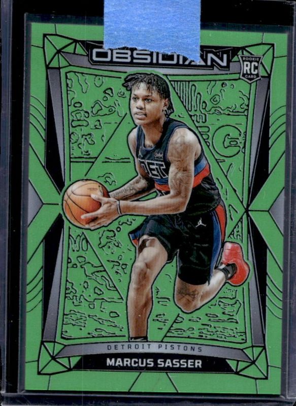 The Marcus Sasser 2023 Obsidian #156 Electric Etch Green Flood /25 Rookie card is 1 of 92 Marcus Sasser's card variations in the 2023 Obsidian set being tracked by Sports Card Investor, including #203 Base, #156 Base, #156 Electric Etch International, #156 Electric Etch Neon Flood, and #156 Electric Etch Pink Pulsar.