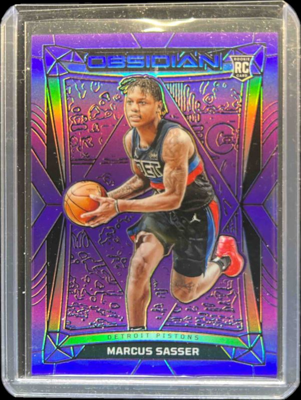 The Marcus Sasser 2023 Obsidian #156 Electric Etch Purple Flood /49 Rookie card is 1 of 92 Marcus Sasser's card variations in the 2023 Obsidian set being tracked by Sports Card Investor, including #203 Base, #156 Base, #156 Electric Etch International, #156 Electric Etch Neon Flood, and #156 Electric Etch Pink Pulsar.