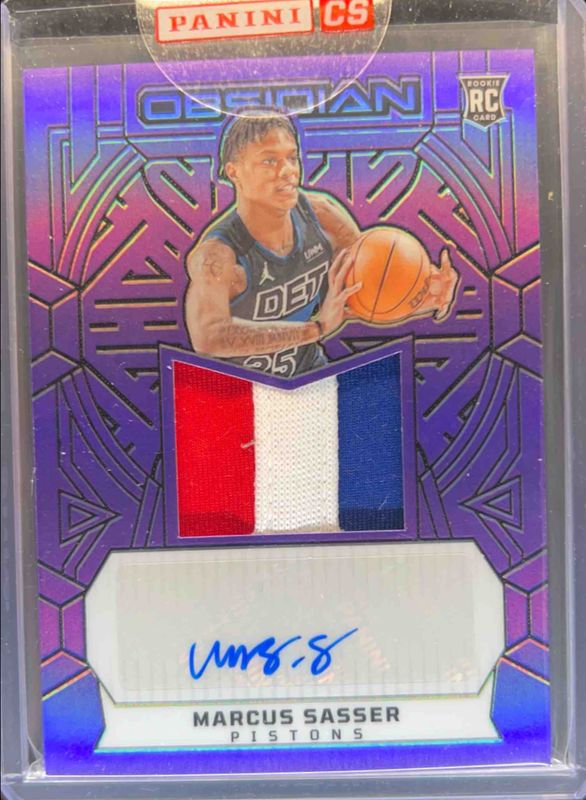 The Marcus Sasser 2023 Obsidian #203 Electric Etch Purple Flood /49 Rookie card is 1 of 92 Marcus Sasser's card variations in the 2023 Obsidian set being tracked by Sports Card Investor, including #203 Base, #156 Base, #156 Electric Etch International, #156 Electric Etch Neon Flood, and #156 Electric Etch Pink Pulsar.