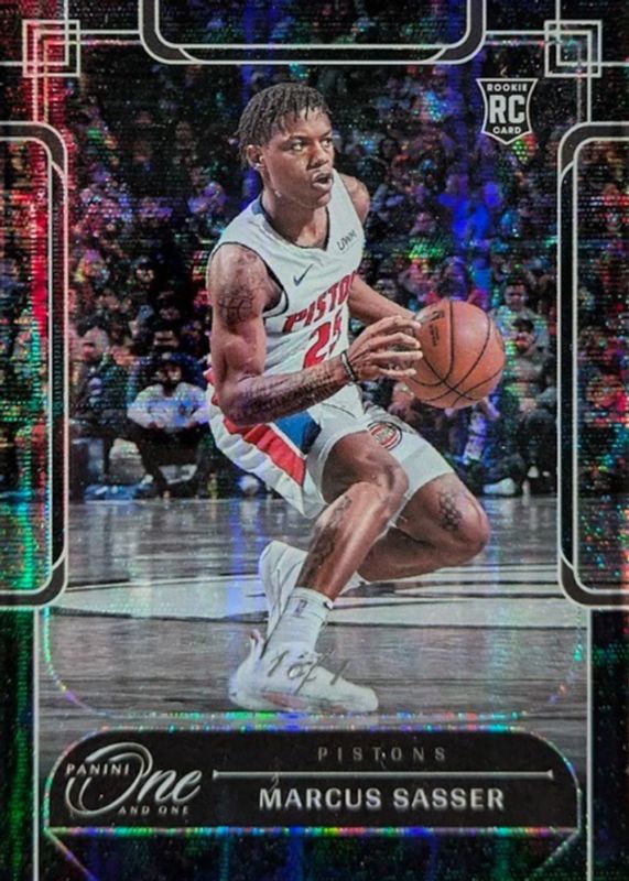 This card is 1 of 21 Marcus Sasser's card variations in the 2023 One and One set being tracked by Sports Card Investor, including Base /99, Blue /35, Purple /25, Red /15, and Gold /10.