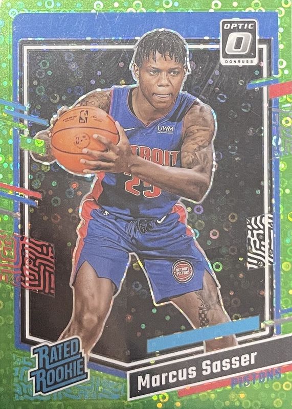 The Marcus Sasser 2023 Optic #242 Fast Break Neon Green /5 Rookie card in Raw condition has not changed in price in the last 30 days and was last sold for $21.50 .