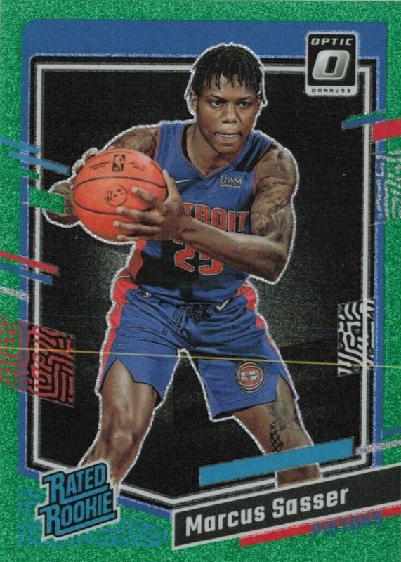 The Marcus Sasser 2023 Optic #242 Green Glitter /77 Rookie card in Raw condition has not changed in price in the last 30 days and was last sold for $6.00 .