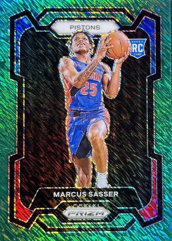 The Marcus Sasser 2023 Prizm #174 Green Shimmer /5 Rookie card in Raw condition has not changed in price in the last 30 days and was last sold for $155.50 .