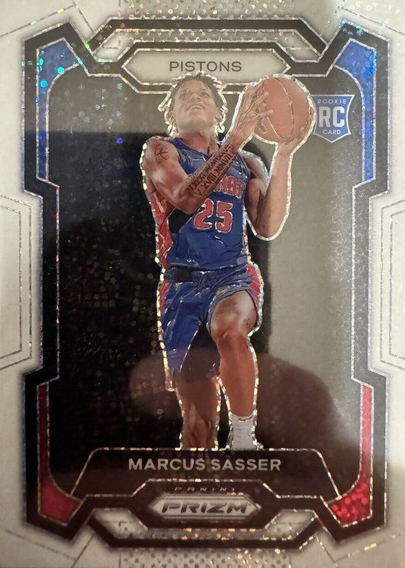 The Marcus Sasser 2023 Prizm #174 White Sparkle /(SSP) Rookie card in Raw condition has not changed in price in the last 30 days and was last sold for $25.00 .