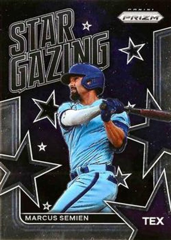 The Marcus Semien 2022 Prizm #SG-3 Star Gazing card is 1 of 82 Marcus Semien's card variations in the 2022 Prizm set being tracked by Sports Card Investor, including Base, Blue, Blue Velocity, Carolina Blue, and Cosmic Haze.
