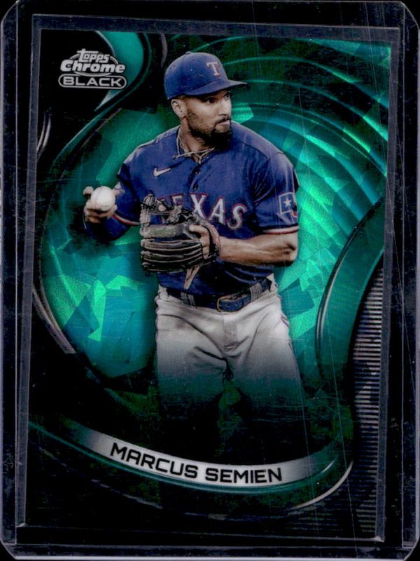 The Marcus Semien 2022 Topps Chrome Black #20 Green Atomic Refractor /99 card is 1 of 20 Marcus Semien's card variations in the 2022 Topps Chrome Black set being tracked by Sports Card Investor, including Base, Refractor /199, Purple Mini Diamond Refractor /150, Green Refractor /99, and Blue Refractor /75.