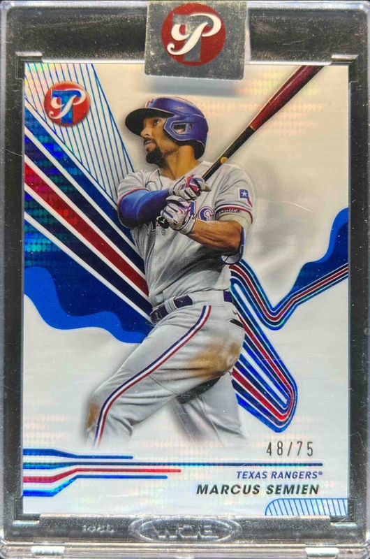 The Marcus Semien 2024 Topps Pristine #242 Pristine Blue Refractor /75 card is 1 of 57 Marcus Semien's card variations in the 2024 Topps Pristine set being tracked by Sports Card Investor, including #271 Base, #242 Base, #271 Pristine Refractor, #242 Pristine Refractor, and #242 Refractor.