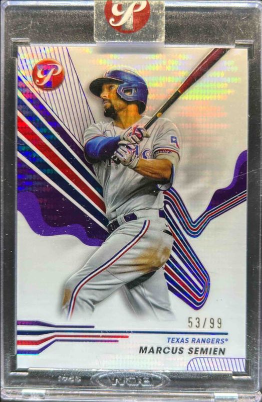 The Marcus Semien 2024 Topps Pristine #242 Pristine Purple Refractor /99 card is 1 of 57 Marcus Semien's card variations in the 2024 Topps Pristine set being tracked by Sports Card Investor, including #271 Base, #242 Base, #271 Pristine Refractor, #242 Pristine Refractor, and #242 Refractor.