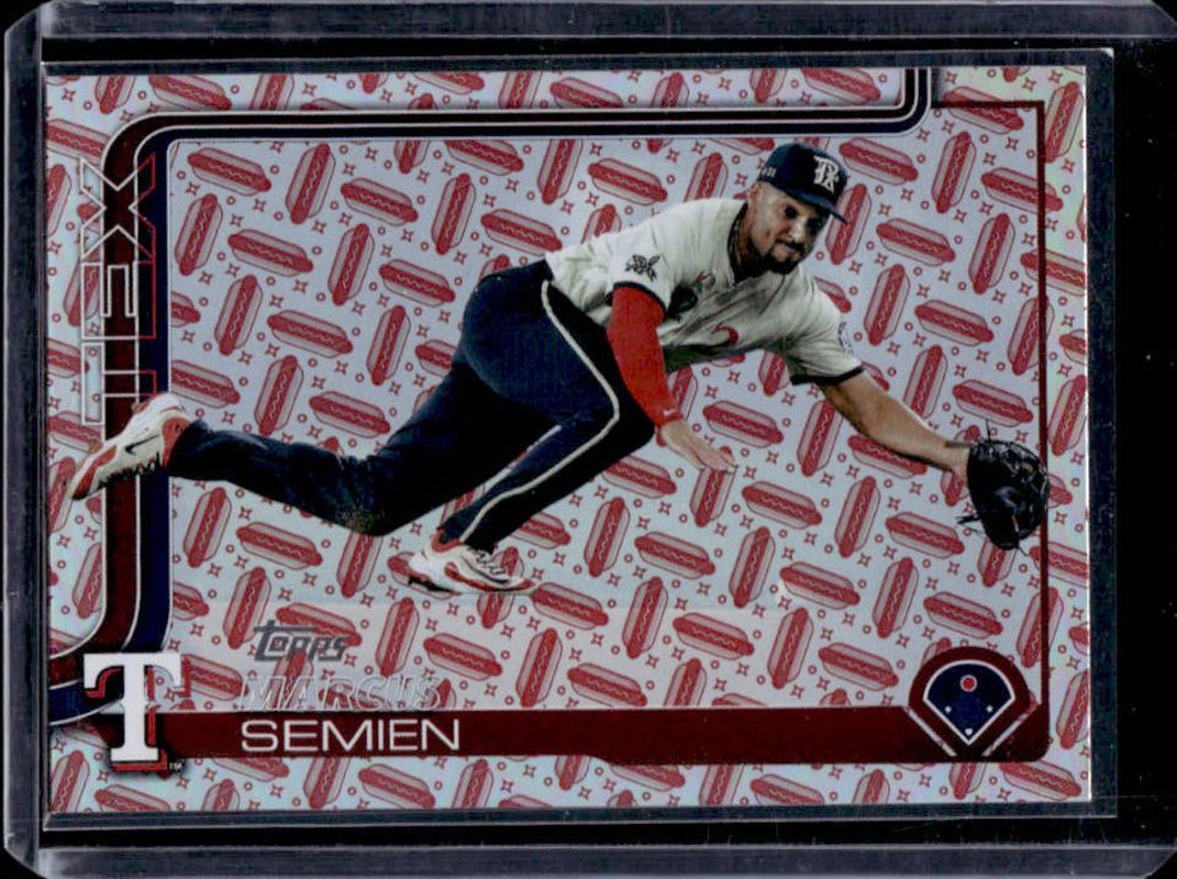 The Marcus Semien 2025 Topps #383 Holiday Hot Dogs /99 card is 1 of 94 Marcus Semien's card variations in the 2025 Topps set being tracked by Sports Card Investor, including Base, Aqua Holo Foil, Diamante Foil, Holo Foil, and Pink Diamante Foil.
