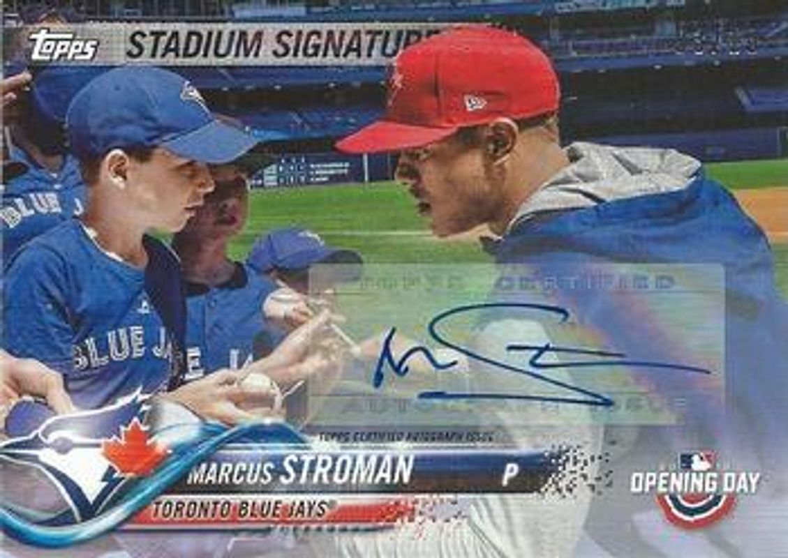The Marcus Stroman 2018 Topps Opening Day #SS-MS Stadium Signatures Autographs /10 card is 1 of 15 Marcus Stroman's card variations in the 2018 Topps Opening Day set being tracked by Sports Card Investor, including Base, Maple Leaf, Opening Day Edition Blue Foil, Purple, and 5x7 /49.