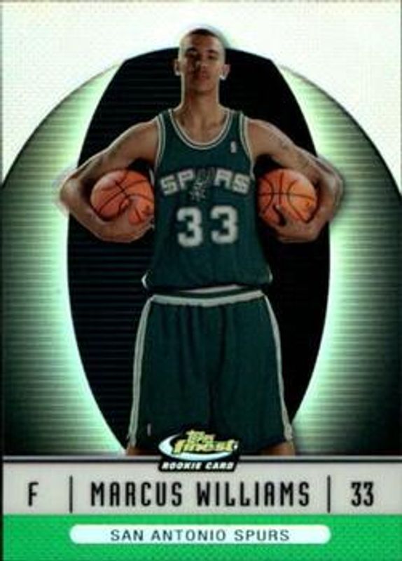 The Marcus Williams 2006 Topps Finest #130 Green Refractor /199 card is 1 of 34 Marcus Williams' card variations in the 2006 Topps Finest set being tracked by Sports Card Investor, including #130 Base /539, #74 Base /539, #130 X-Fractor /25, #74 X-Fractor /25, and #130 Printing Plates Black /1.