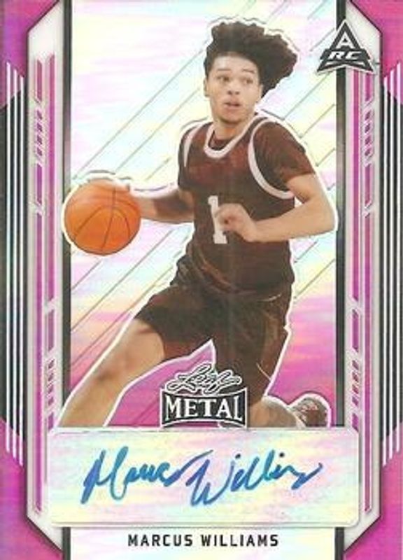 The Marcus Williams 2021 Leaf Metal #BA-MW1 Pink Rainbow /25 card is 1 of 88 Marcus Williams' card variations in the 2021 Leaf Metal set being tracked by Sports Card Investor, including Base, Silver Crystal, Silver Mojo, Silver Wave, and Blue Rainbow /50.