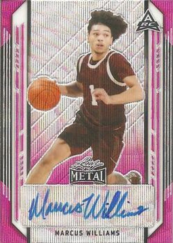 The Marcus Williams 2021 Leaf Metal #BA-MW1 Pink Wave /20 card is 1 of 88 Marcus Williams' card variations in the 2021 Leaf Metal set being tracked by Sports Card Investor, including Base, Silver Crystal, Silver Mojo, Silver Wave, and Blue Rainbow /50.