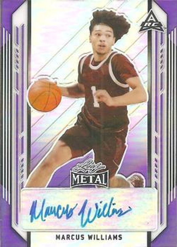 The Marcus Williams 2021 Leaf Metal #BA-MW1 Purple Rainbow /30 card is 1 of 88 Marcus Williams' card variations in the 2021 Leaf Metal set being tracked by Sports Card Investor, including Base, Silver Crystal, Silver Mojo, Silver Wave, and Blue Rainbow /50.