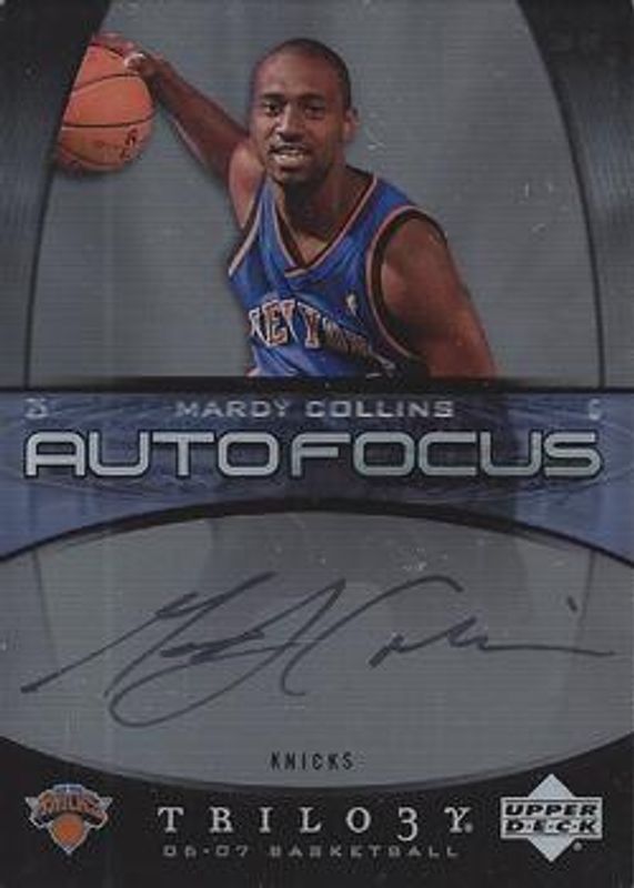 The Mardy Collins 2006 Upper Deck Trilogy #AF-MC Auto Focus Rookie card is 1 of 7 Mardy Collins' card variations in the 2006 Upper Deck Trilogy set being tracked by Sports Card Investor, including Base /499, Blue /33, Gold /10, Generations Future Memorabilia, and Generations Future Signatures.