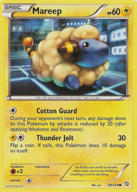 The Mareep 2012 Black & White: Dragons Exalted #038/124 Base card in Raw TCG (Near Mint) condition has moved down -$6.24 (-85.2%) in the last 30 days and was last sold for $1.08 .