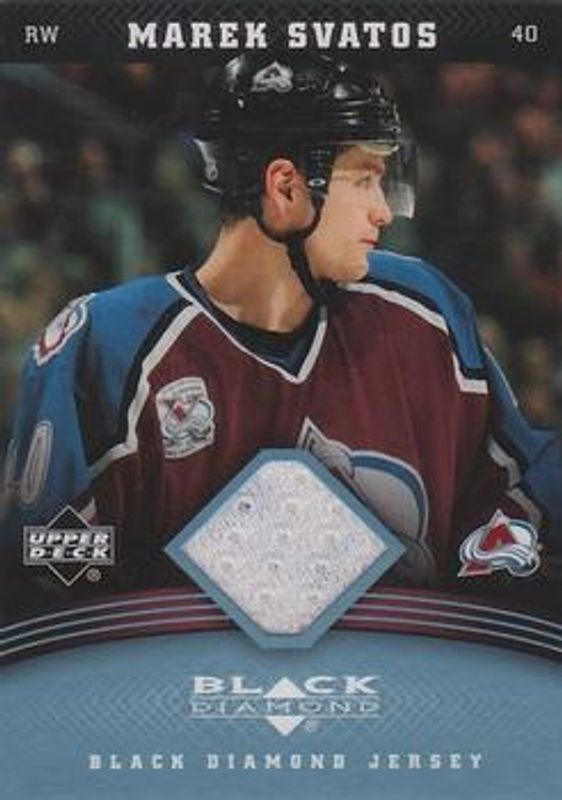 The Marek Svatos 2006 Upper Deck Black Diamond #J-MS Jerseys card is 1 of 9 Marek Svatos' card variations in the 2006 Upper Deck Black Diamond set being tracked by Sports Card Investor, including Base, Ruby /100, Gold /10, Black /1, and Jerseys Ruby /100.
