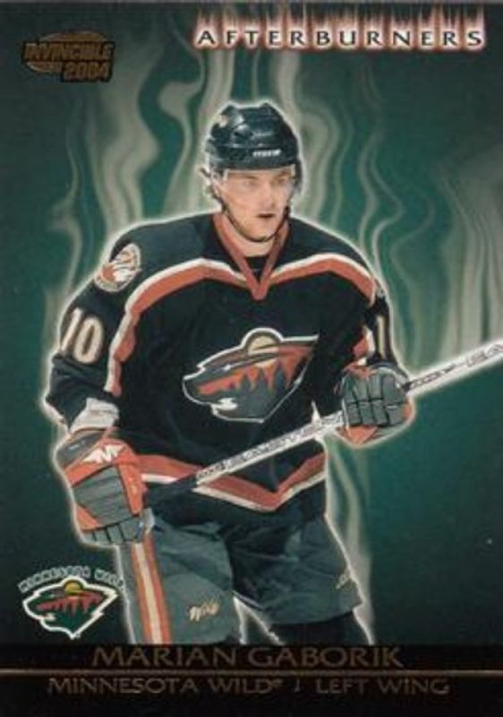 The Marian Gaborik 2003 Pacific Invincible #6 Afterburners card is 1 of 7 Marian Gaborik's card variations in the 2003 Pacific Invincible set being tracked by Sports Card Investor, including Base /799, Retail, Red /850, Blue /350, and Featured Performers.