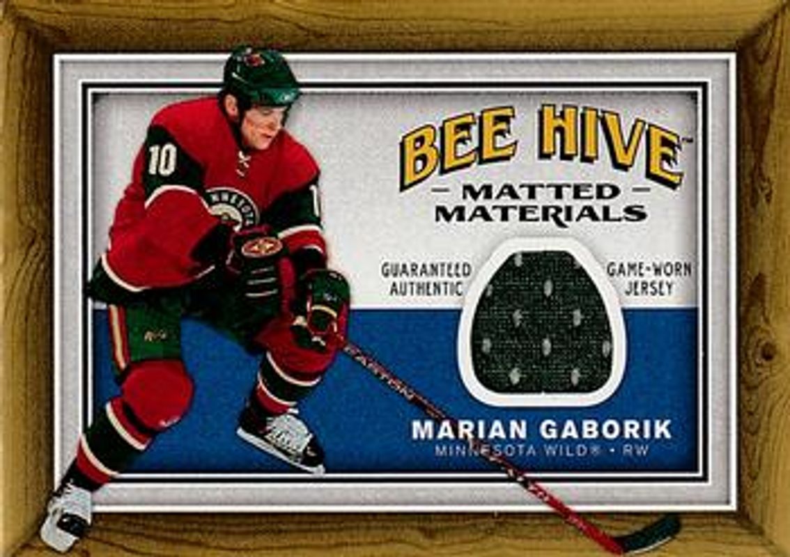 The Marian Gaborik 2006 Upper Deck Beehive #MM-MG Matted Materials card is 1 of 12 Marian Gaborik's card variations in the 2006 Upper Deck Beehive set being tracked by Sports Card Investor, including Base, 5x7 Photo Cards, 5x7 Variation, Blue, and Gold.