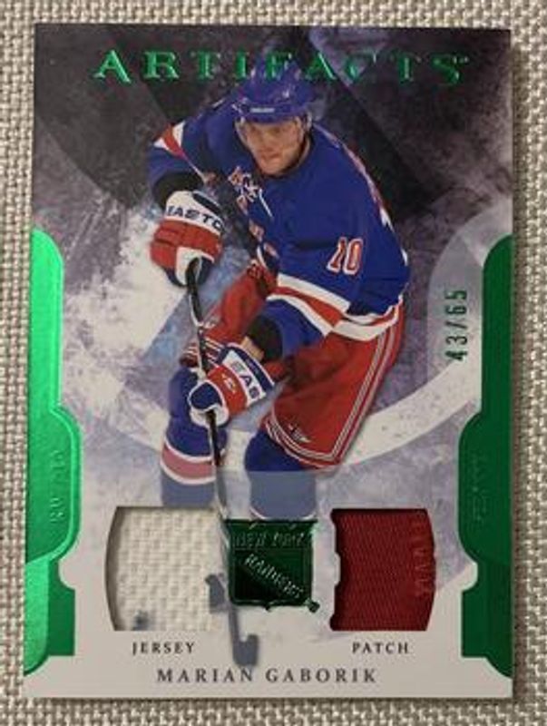 The Marian Gaborik 2011 Upper Deck Artifacts #10 Jerseys Patch - Emerald /65 card is 1 of 24 Marian Gaborik's card variations in the 2011 Upper Deck Artifacts set being tracked by Sports Card Investor, including #10 Base /699, #133 Base /699, #10 Emerald /99, #133 Emerald /99, and #133 Spectrum /25.