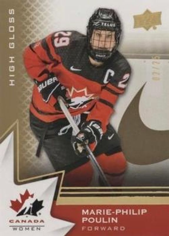 The Marie-Philip Poulin 2020 Upper Deck Team Canada Juniors #48 High Gloss /15 card is 1 of 25 Marie-Philip Poulin's card variations in the 2020 Upper Deck Team Canada Juniors set being tracked by Sports Card Investor, including #48 Base, #74 Base, #74 Exclusives /165, #48 Exclusives /165, and #74 High Gloss /15.