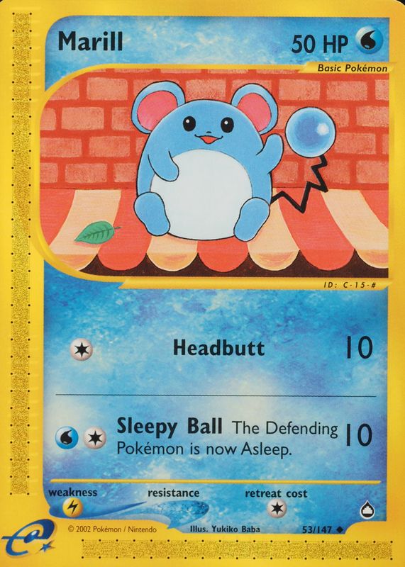 The Marill 2003 Aquapolis #053/147 Base card in Raw TCG (Near Mint) condition has not changed in price in the last 30 days and was last sold for $19.99 .