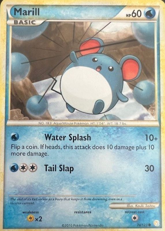 The Marill 2010 HeartGold & SoulSilver #074/123 Base card in Raw TCG (Lightly Played) condition has moved down -$1.51 (-50.5%) in the last 30 days and was last sold for $1.48 .