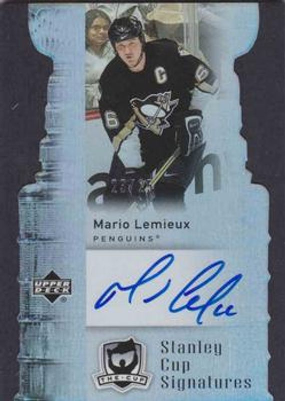 The Mario Lemieux 2006 Upper Deck The Cup #CS-ML Stanley Cup Signatures /25 card is 1 of 26 Mario Lemieux's card variations in the 2006 Upper Deck The Cup set being tracked by Sports Card Investor, including Base /249, Gold /25, Black Rainbow /1, Printing Plates Black /1, and Printing Plates Cyan /1.
