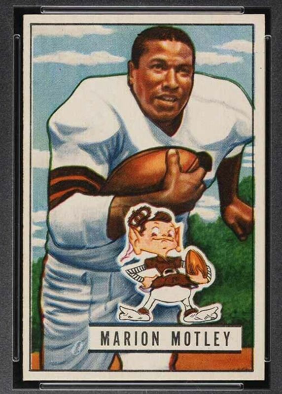 Marion Motley's Football cards are available in at least 4 sets. Marion Motley's biggest 7-day price movers are 1951 Bowman #109 Base, 1950 Bowman #43 Base, and 2004 Topps Signature #CC-MM Canton Cuts Autographs /1.
