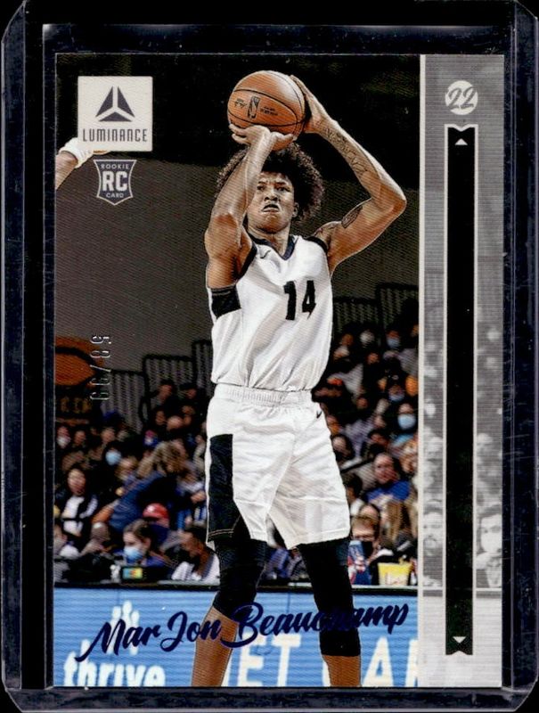The MarJon Beauchamp 2022 Chronicles Draft Picks #19 Luminance - Blue /99 Rookie card is 1 of 139 MarJon Beauchamp's card variations in the 2022 Chronicles Draft Picks set being tracked by Sports Card Investor, including Base, Black, Bronze, Pink, and Pulsar.