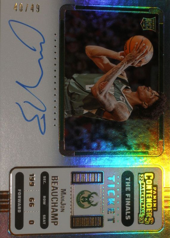 The MarJon Beauchamp 2022 Contenders #143 Rookie Ticket Auto Variation - The Finals Ticket /49 card in Raw condition has not changed in price in the last 30 days and was last sold for $11.50 .