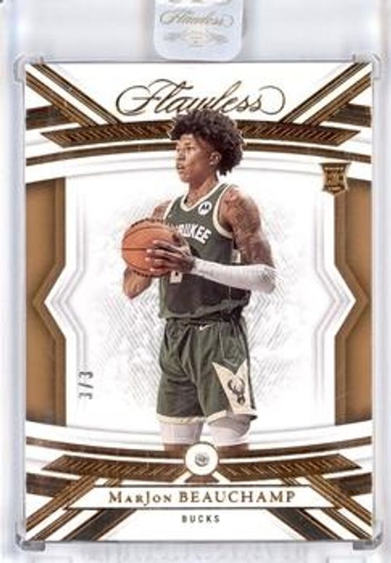 The MarJon Beauchamp 2022 Flawless #38 Bronze /3 Rookie card is 1 of 54 MarJon Beauchamp's card variations in the 2022 Flawless set being tracked by Sports Card Investor, including Base /5, Gold /10, Emerald /5, Platinum /1, and Distinguished Autographs /25.