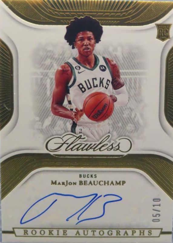 The MarJon Beauchamp 2022 Flawless #DA-MJB Distinguished Autographs - Gold /10 Rookie card in Raw condition has not changed in price in the last 30 days and was last sold for $40.00 .