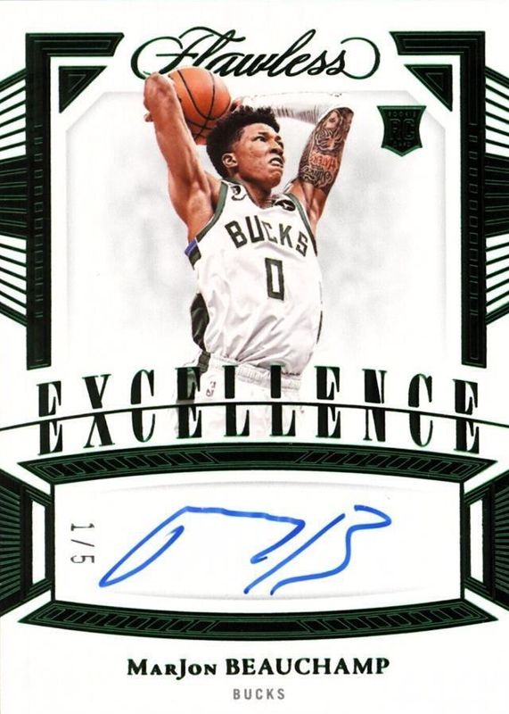 This card is 1 of 39 MarJon Beauchamp's card variations in the 2022 Flawless set being tracked by Sports Card Investor, including Distinguished Autographs /25, Excellence Signatures /25, Flawless Patch Autographs /25, Rookie Autographs /25, and Signature Prime Materials /25.