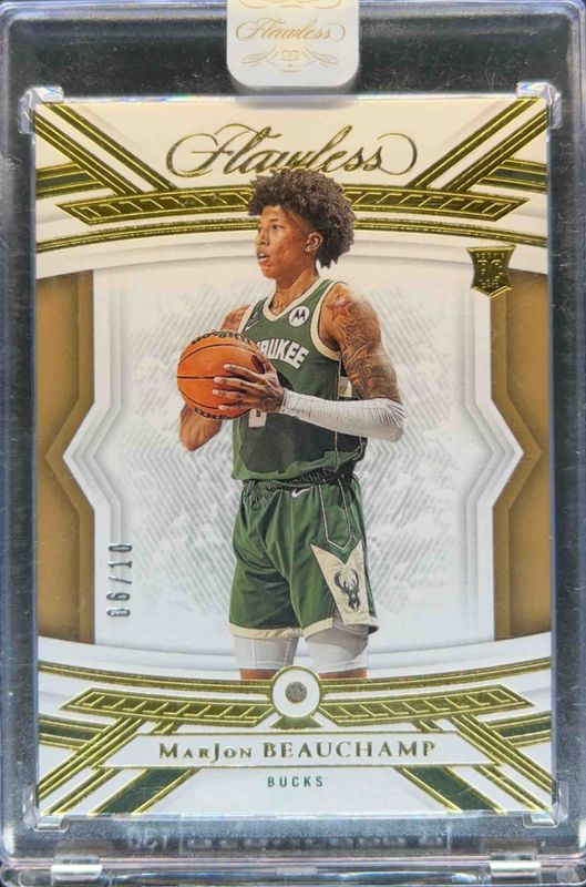 The MarJon Beauchamp 2022 Flawless #38 Gold /10 Rookie card is 1 of 54 MarJon Beauchamp's card variations in the 2022 Flawless set being tracked by Sports Card Investor, including Base /5, Emerald /5, Bronze /3, Platinum /1, and Distinguished Autographs /25.