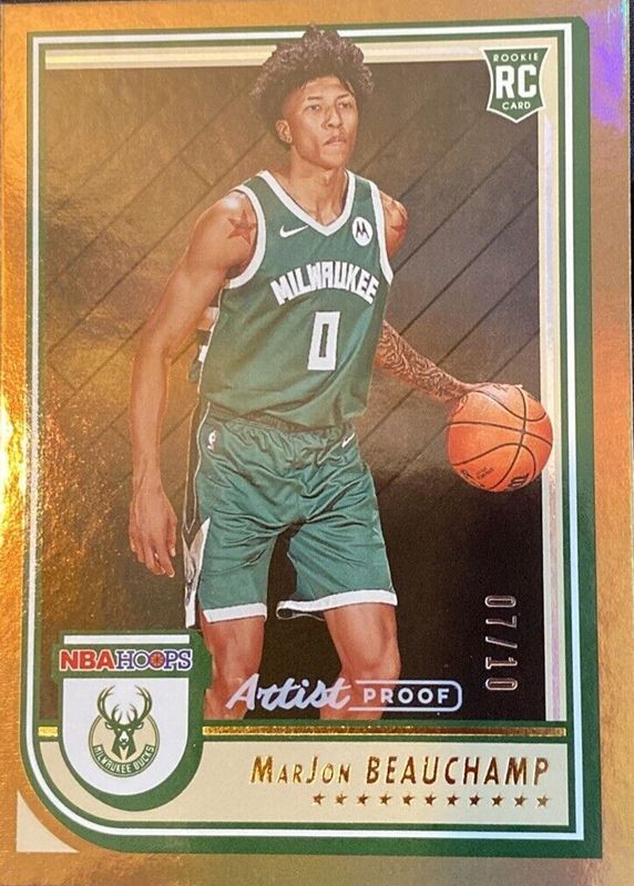 The MarJon Beauchamp 2022 Hoops #254 Artist Proof Gold /10 Rookie card in Raw condition has not changed in price in the last 30 days and was last sold for $125.00 .