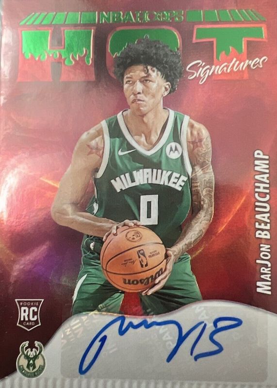 The MarJon Beauchamp 2022 Hoops #HSR-MJB Hot Signatures Rookies - Green card in Raw condition has not changed in price in the last 30 days and was last sold for $25.55 .