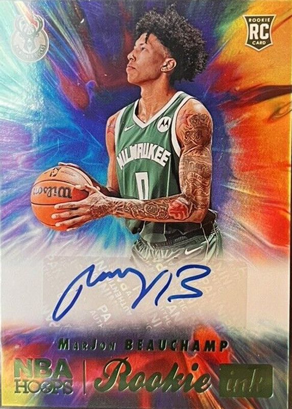 The MarJon Beauchamp 2022 Hoops #RI-MJB Rookie Ink - Green card in Raw condition has not changed in price in the last 30 days and was last sold for $10.75 .