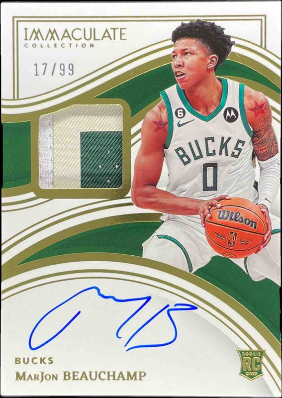 The MarJon Beauchamp 2022 Immaculate #111 Base /99 Rookie card is 1 of 28 MarJon Beauchamp's card variations in the 2022 Immaculate set being tracked by Sports Card Investor, including Red /49, Gold /10, Premium Patch Autographs, Premium Patch Autographs - FOTL, and Premium Patch Autographs - Gold.