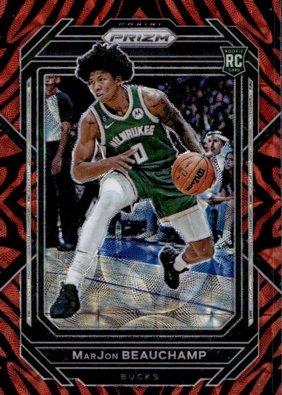 The MarJon Beauchamp 2022 Prizm #268 Choice Tiger Stripe /(SSP) Rookie card in Raw condition has not changed in price in the last 30 days and was last sold for $10.50 .
