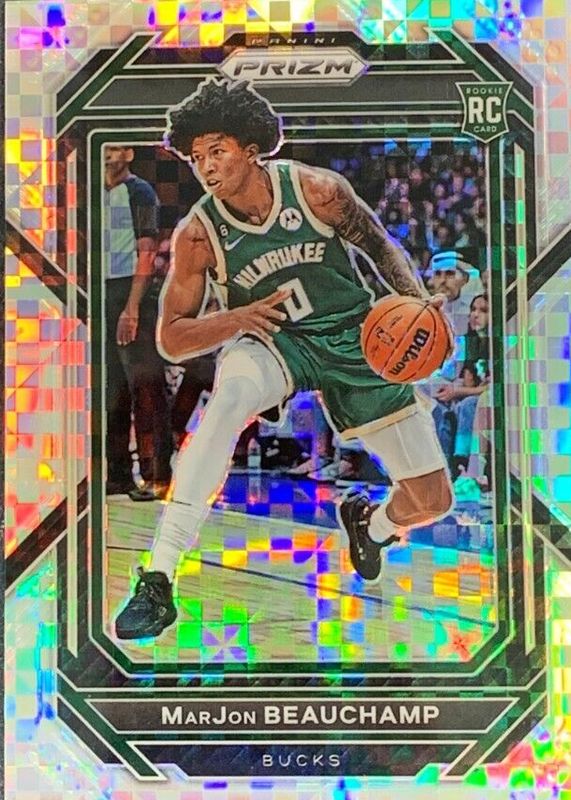 This card is 1 of 67 MarJon Beauchamp's card variations in the 2022 Prizm set being tracked by Sports Card Investor, including Base, Blue Wave, Choice Blue Yellow Green, Fast Break, and Green.