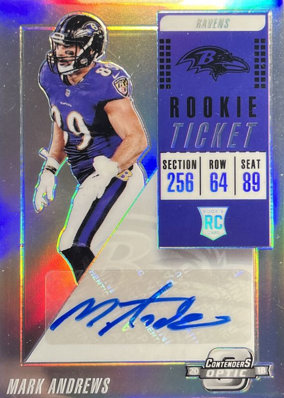 This card is 1 of 6 Mark Andrews' card variations in the 2018 Contenders Optic set being tracked by Sports Card Investor, including Rookie Ticket Auto - Blue (/25), Rookie Ticket Auto - Orange (/49), Rookie Ticket Auto - Purple (/99), Rookie Ticket Auto - Gold /10, and Rookie Ticket Auto - Gold Vinyl /1.