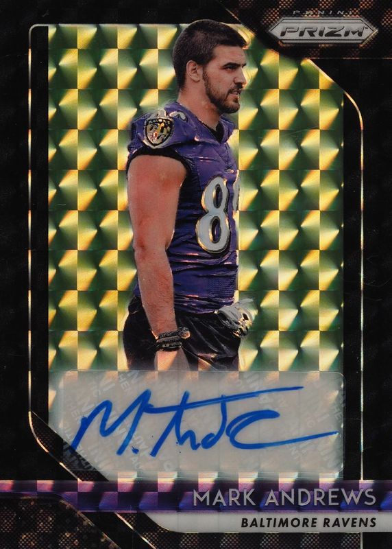 This card is 1 of 17 Mark Andrews' card variations in the 2018 Prizm set being tracked by Sports Card Investor, including Rookie Autographs, Rookie Autographs - Blue Scope (/99), Rookie Autographs - Camo (/25), Rookie Autographs - Disco, and Rookie Autographs - Gold (/10).