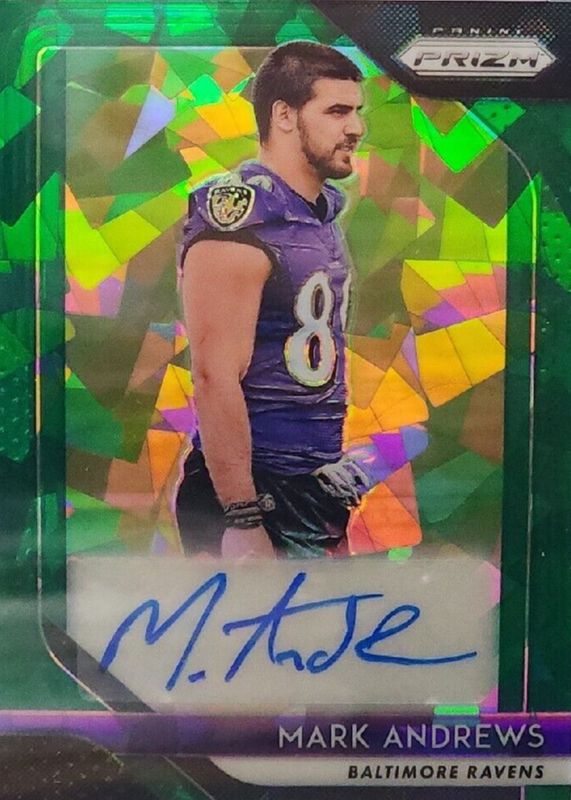 This card is 1 of 17 Mark Andrews' card variations in the 2018 Prizm set being tracked by Sports Card Investor, including Rookie Autographs, Rookie Autographs - Blue Scope (/99), Rookie Autographs - Camo (/25), Rookie Autographs - Disco, and Rookie Autographs - Gold (/10).