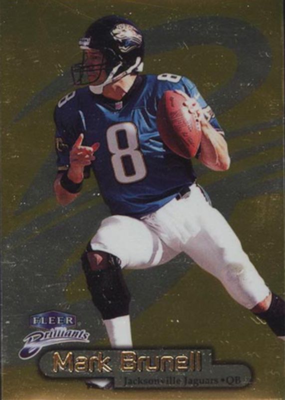 This card is 1 of 9 Mark Brunell's card variations in the 1998 Fleer Brilliants set being tracked by Sports Card Investor, including #100 Base, #100B Blue, #4SS Shining Stars, #4 Shining Stars, and #100G Gold /99.