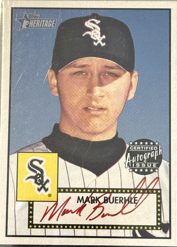 The Mark Buehrle 2001 Topps Heritage #THA-MB Real One Autographs - Red Ink /52 card in Raw condition has not changed in price in the last 30 days and was last sold for $325.00 .